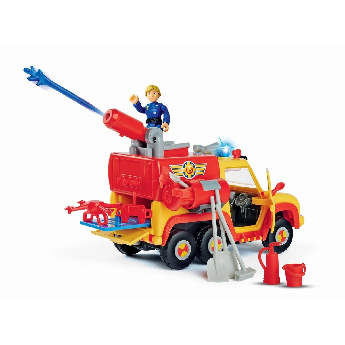 Les portes du pick-up s’ouvrent pour que Sam puisse conduire. Le pick-up fonce en roues libres et possède tous les attributs d’un vrai. Avec Sam le Pompier Pick up Venus 2 tu éteins tous les feux avec la lance à incendie : les flèches d’eau sont fournies en accessoires ! De plus, le câble enrouleur à l’avant du camion te permet de soulever les obstacles ou remorquer d’autres véhicules de la gamme !