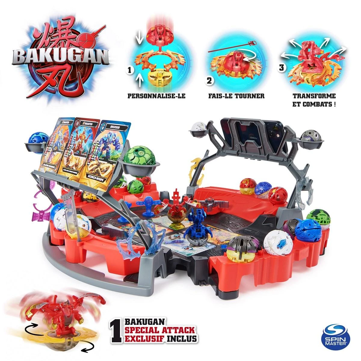 L’Arène de combat Bakugan contient : 1 arène avec zone de combat, obstacles et zones d’exposition, 1 Bakugan Special Attack, 1 anneau, 1 lanceur et 4 cartes. L’arène mesure plus de 50 cm de long. Avec des supports de chaque côté pour positionner ses billes Bakugan, ses cartes et partir au combat. Les billes Bakugan se déploient et se transforment en créatures fabuleuses lorsqu’elles sont envoyées correctement sur les cartes aimantées.