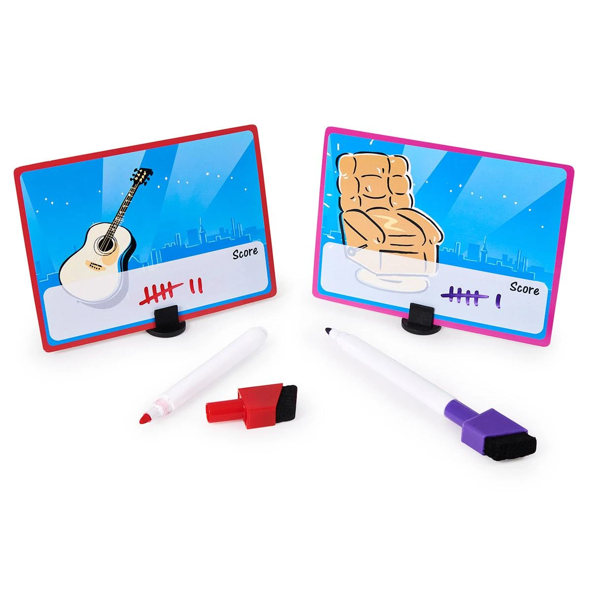 Contenu du jeu Friends – Jeu de questions – Celui qui pariait l’appartement de Spin Master : 250 cartes question, 1 plateau de jeu effaçable à sec, 1 support en carton, 2 cartes géantes effaçables à sec, 2 supports en plastique, 1 sablier, 1 règle du jeu.