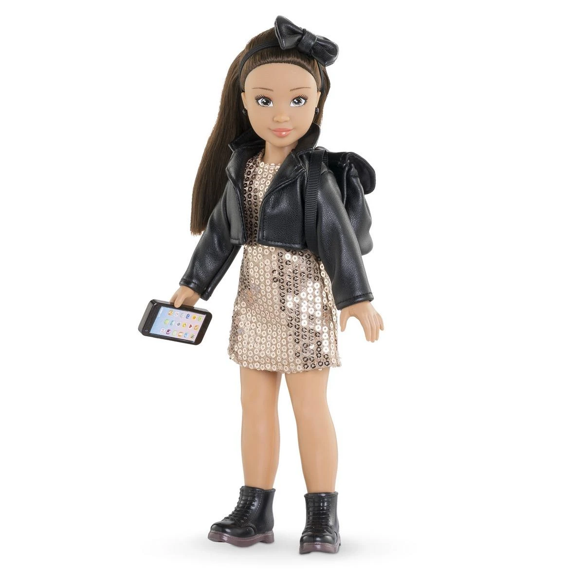 Trop chic ! Le coffret Tenue Corolle girl – dressing de fête constitue une tenue complète composée de 7 accessoires ultra-tendance pour faire la fête : 1 robe dorée à sequins, 1 bandeau noir pour les cheveux, 1 paire de boucles d’oreilles, 1 veste, 1 téléphone portable, 1 sac à dos et 1 paire de bottines noires amovibles.