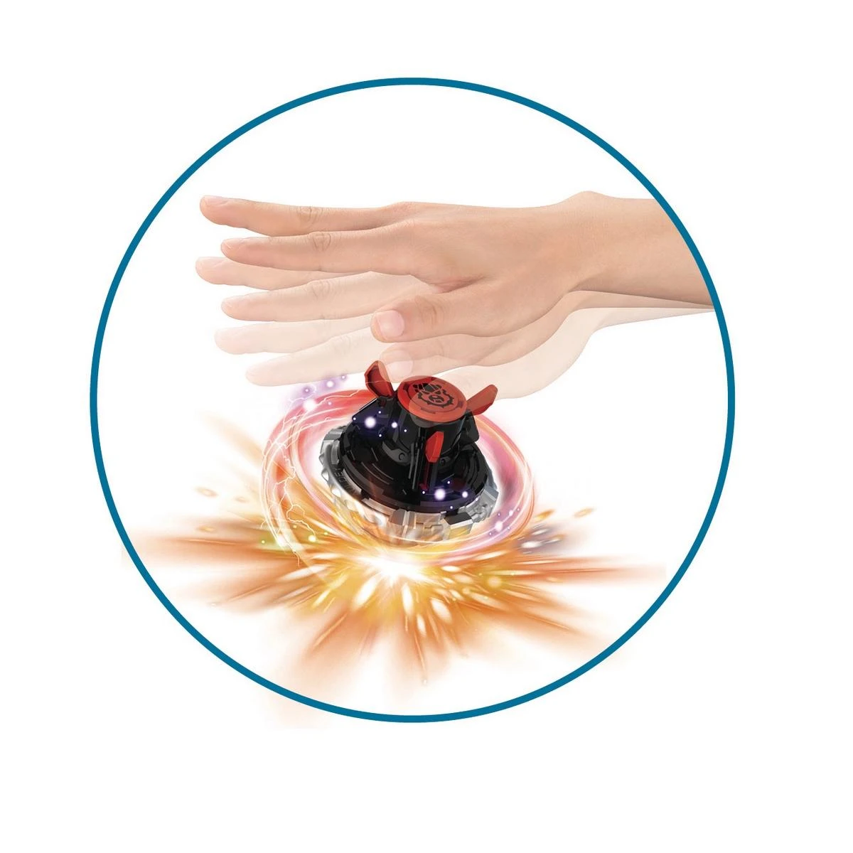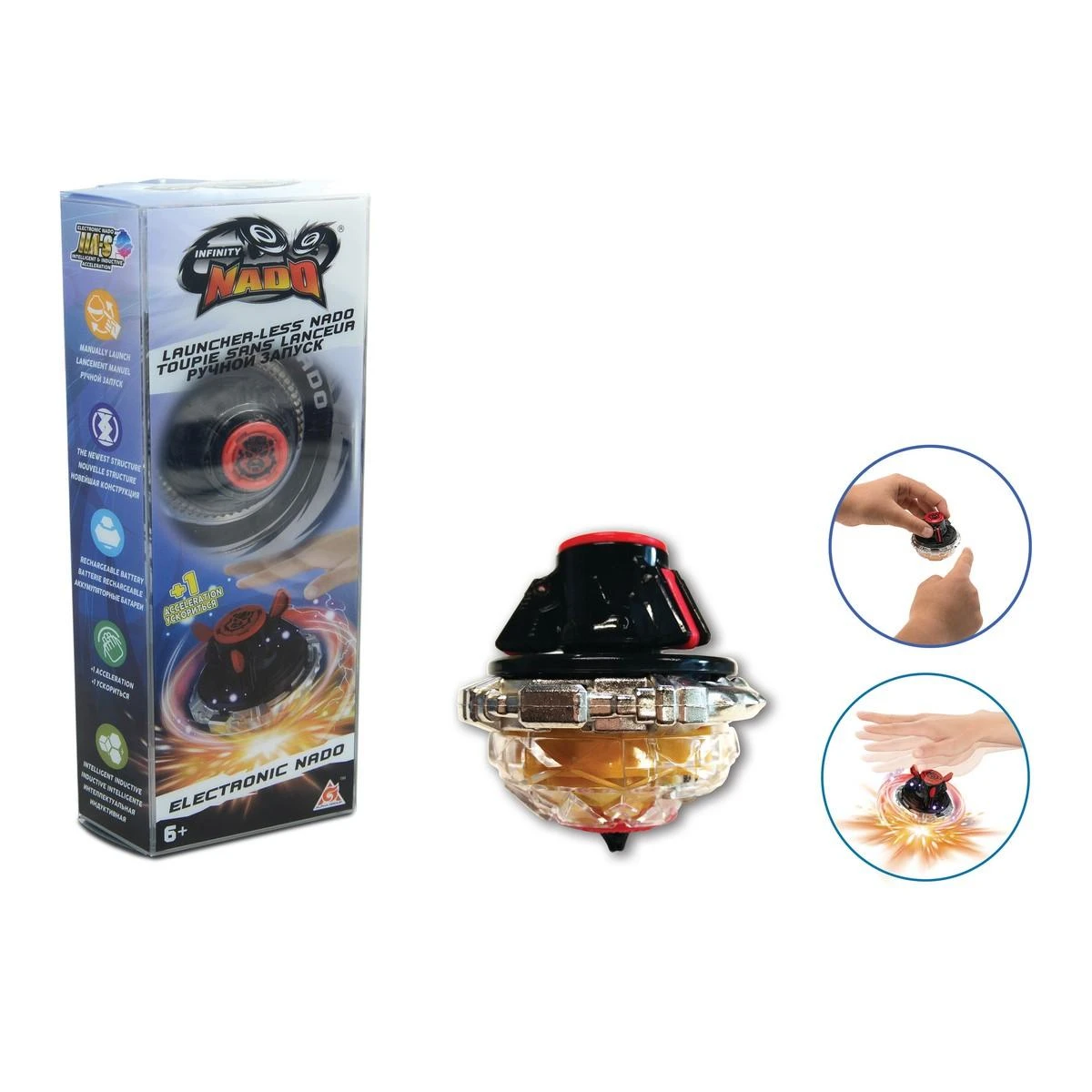 Plus besoin de lanceur avec les toupies Infinity Nado électroniques : lance ta toupie manuellement, elle tourne à la vitesse de l’éclair ! Lorsque la toupie ralentit… Tu peux relancer 1 fois sa vitesse en secouant rapidement ta main au dessus d’elle ! Tente de devenir toi aussi un Maître Nado en remportant tous les duels !