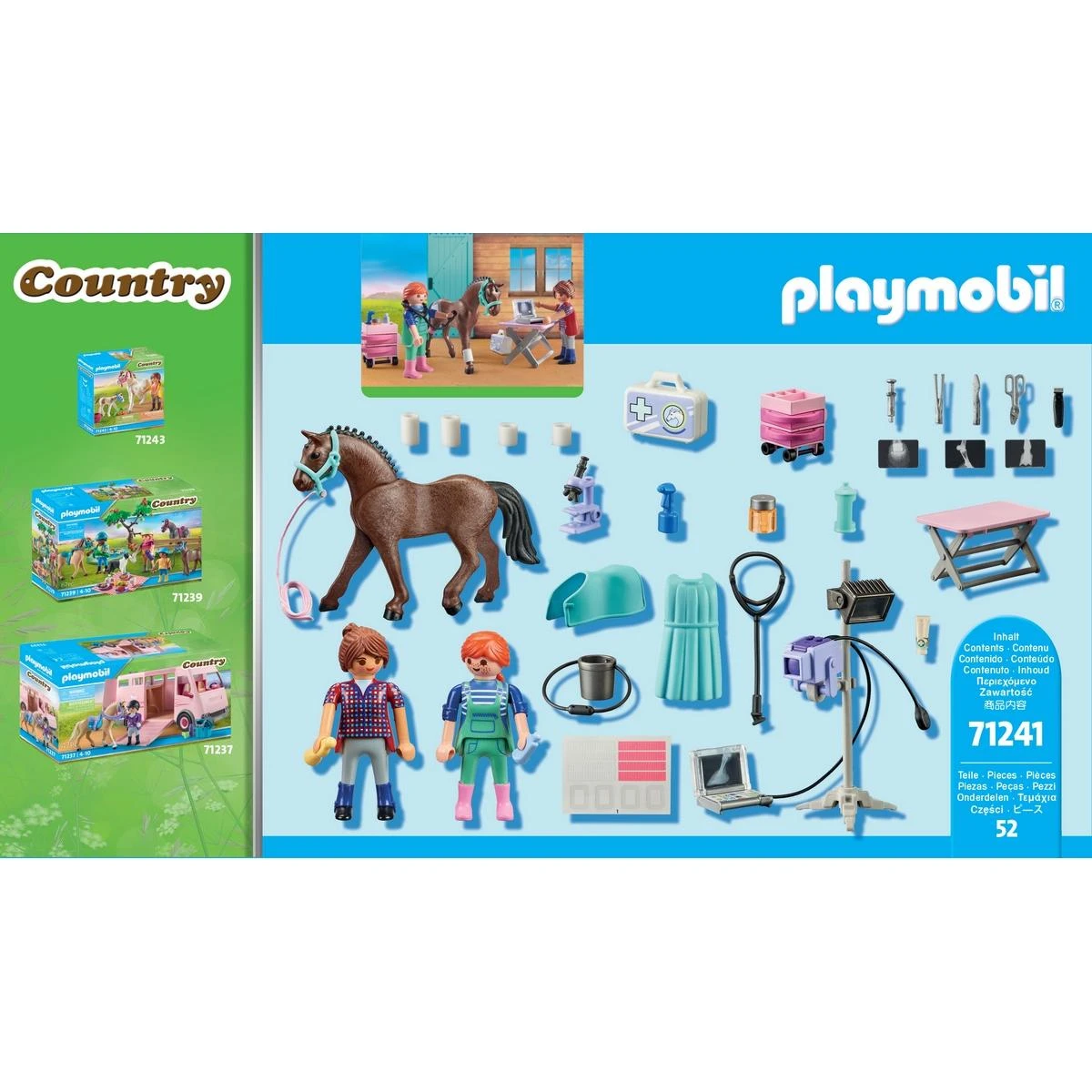 Le coffret Vétérinaire Equin Playmobil Country 71241 contient 2 personnages (1 vétérinaire et 1 cavalière), 1 cheval ainsi que les accessoires indispensables de soin pour les chevaux. 52 pièces. Bon à savoir : d’autres sets Playmobil Country complètent et enrichissent les possibilités de jeu et de collection de votre enfant.