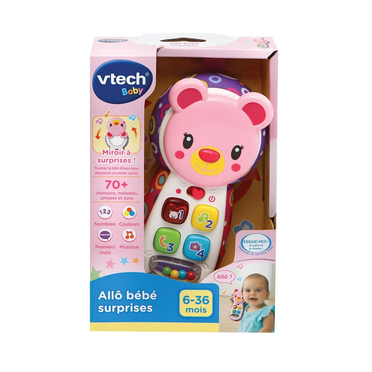 Allo Bébé Surprises Rose de VTech comprend 4 boutons interactifs dont un lumineux pour découvrir les couleurs, les premiers chiffres et écouter de la musique. Bébé manipule le visage de l’ourson et découvre un miroir plein de surprises !