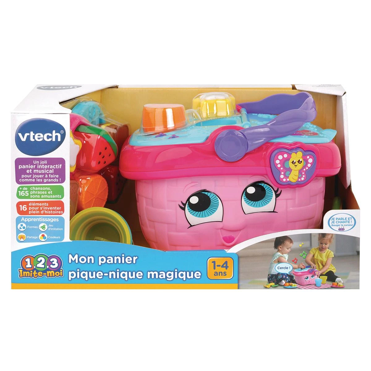 Mon panier pique-nique magique de Vtech est un jeu de rôle idéal pour votre enfant dès 1 ans. Ce panier parlant et musical contient tout le nécessaire pour préparer le pique-nique parfait, de la nappe aux fourchettes ! De plus, le bouton papillon permet d’entendre des phrases éducatives. 2 modes de jeu : formes et couleurs ainsi que le pique-nique. Contient 16 pièces de jeu pour s’inventer plein d’histoires. Plus de 165 chansons, phrases et sons amusants.