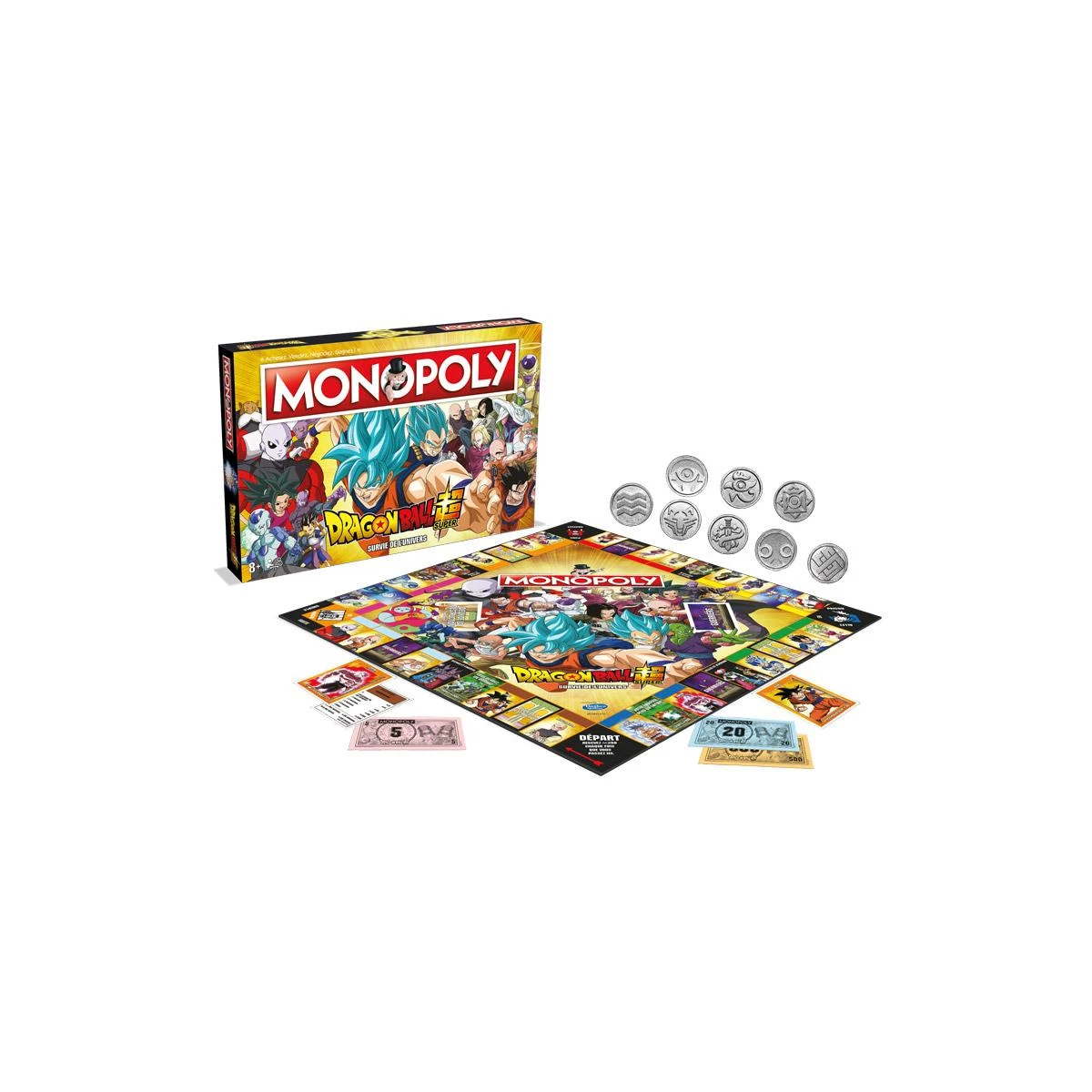 Le tournoi du pouvoir commence, le sort des univers est en jeu ! Dans cette édition du Dragon Ball Super du Monopoly, vous aurez la chance de posséder les personnages iconiques de l’Anime tels que Son Gôku, Piccolo, Son Gohan, Vegeta, Jiren, le Grand Prêtre, Zen’ô, les Dieux de la destruction et bien d’autres. Soyez le premier à acheter un maximum de héros pour gagner la partie en vous déplaçant avec les pions exclusifs ! Les fans de Dragon Ball Super et du Monopoly seront comblés !