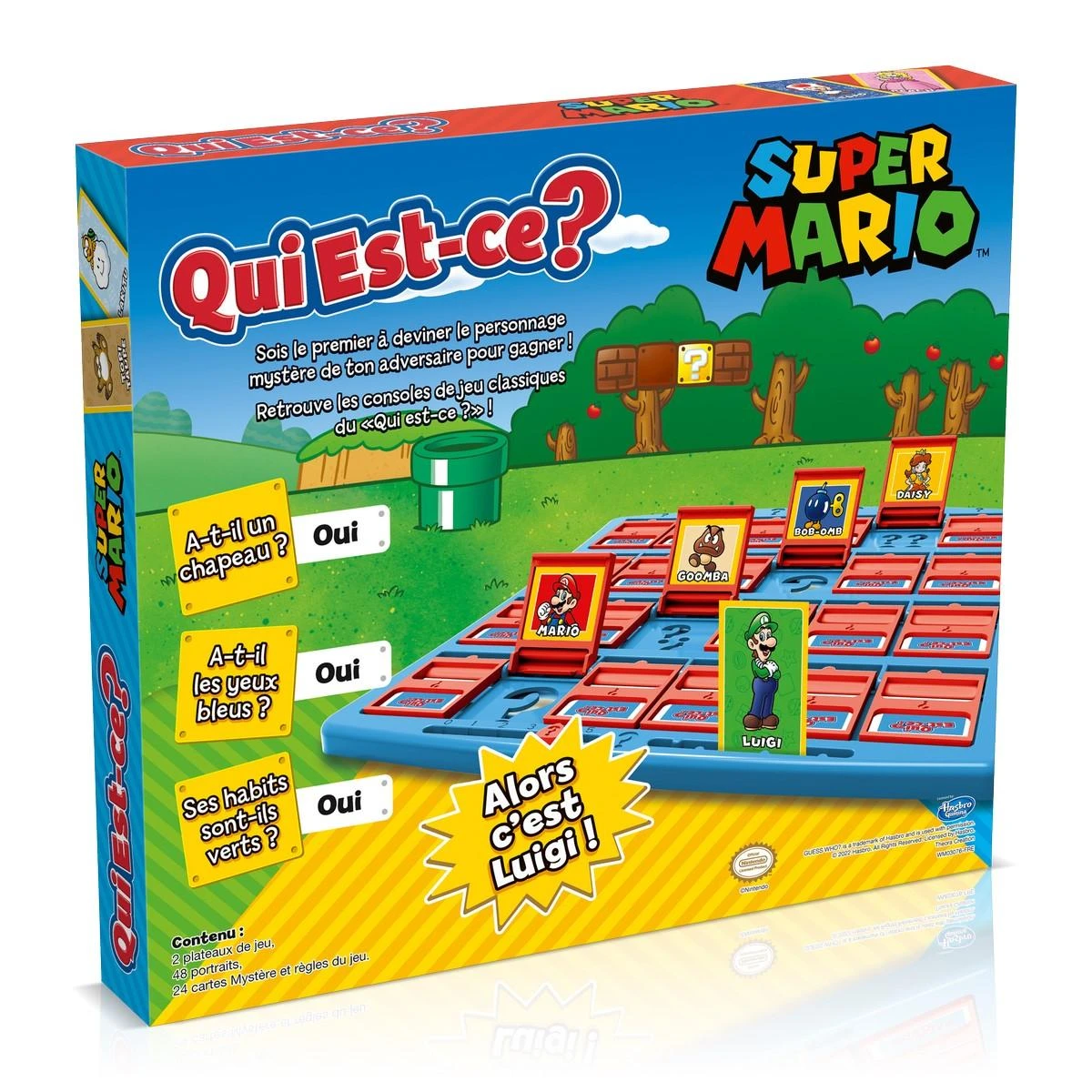 Semblable à un jeu de devinettes, Qui Est-ce? Super Mario se joue avec deux joueurs. L’un doit poser des questions rhétoriques pour savoir quel personnage son adversaire cache-t-il; et les réponses doivent toujours être oui ou non. Vous avez le droit de poser autant de questions que vous voulez, mais une fois que vous donnez un nom, la partie est finie. Vous devez donc savoir poser les bonnes questions. Vous pouvez jouer en famille, à tour de rôle, et deviner les meilleurs personnages possibles. La boîte contient 48 cartes de personnages, 2 plateaux de jeu, 24 cartes mystères ainsi que la règle du jeu. Entre Mario, Peach, Luigi, Daisy et les autres, saurez-vous deviner qui est-ce ?